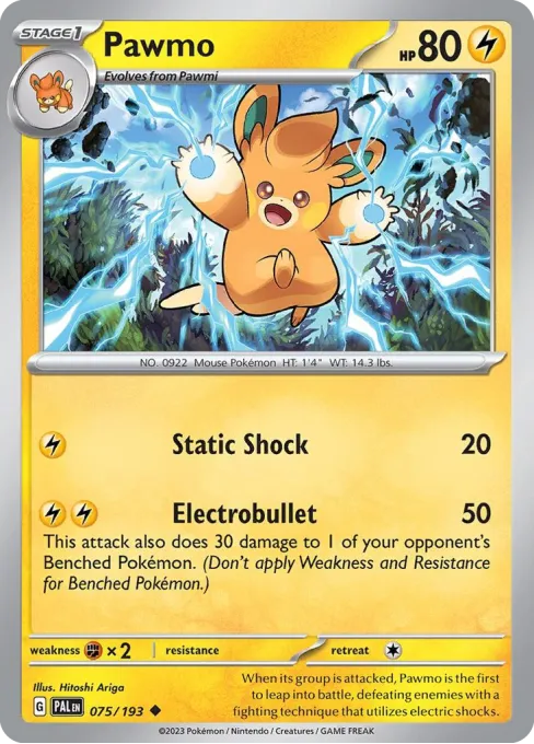 When its group is attacked, Pawmo is the first to leap into battle, defeating enemies with a fighting technique that utilizes electric shocks.