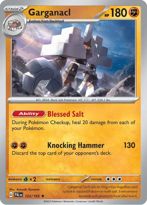 Garganacl will rub its fingertips together and sprinkle injured Pokémon with salt. Even severe wounds will promptly heal afterward.