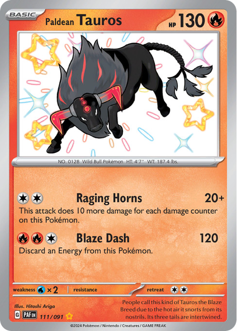 People call this kind of Tauros the Blaze Breed due to the hot air it snorts from its nostrils. Its three tails are intertwined.