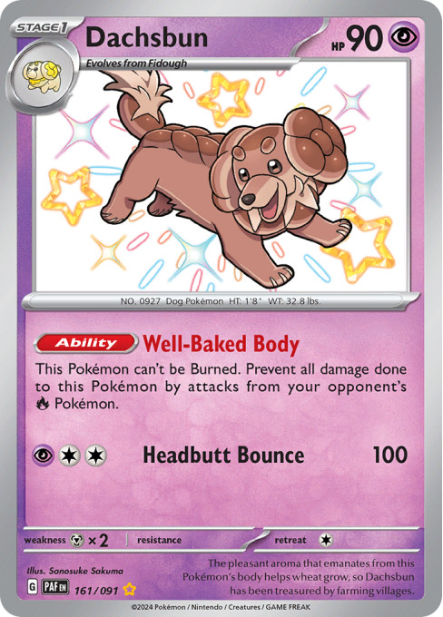 The pleasant aroma that emanates from this Pokémon's body helps wheat grow, so Dachsbun has been treasured by farming villages.