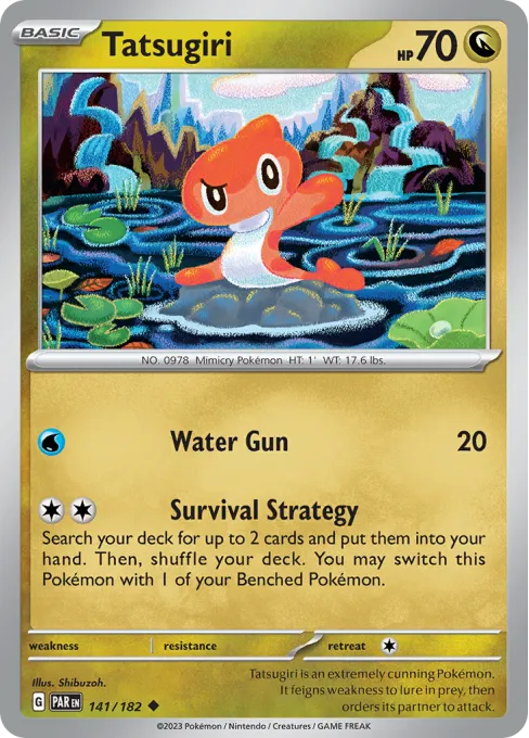 Tatsugiri is an extremely cunning Pokémon. It feigns weakness to lure in prey, then orders its partner to attack.