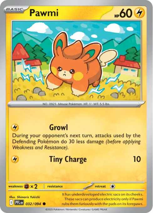 It has underdeveloped electric sacs on its cheeks. These sacs can produce electricity only if Pawmi rubs them furiously with the pads on its forepaws.