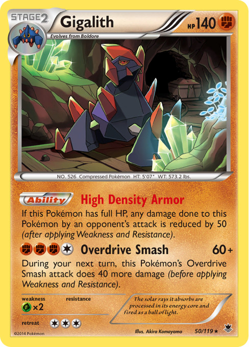 If this Pokémon has full HP, any damage done to this Pokémon by an opponent's attack is reduced by 50 (after applying Weakness and Resistance).