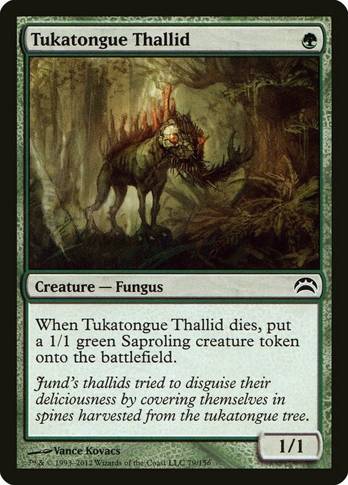 When Tukatongue Thallid dies, create a 1/1 green Saproling creature token.