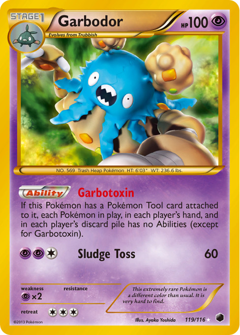 If this Pokémon has a Pokémon Tool card attached to it, each Pokémon in play, in each player's hand, and in each player's discard pile has no Abilities (except for Garbotoxin).