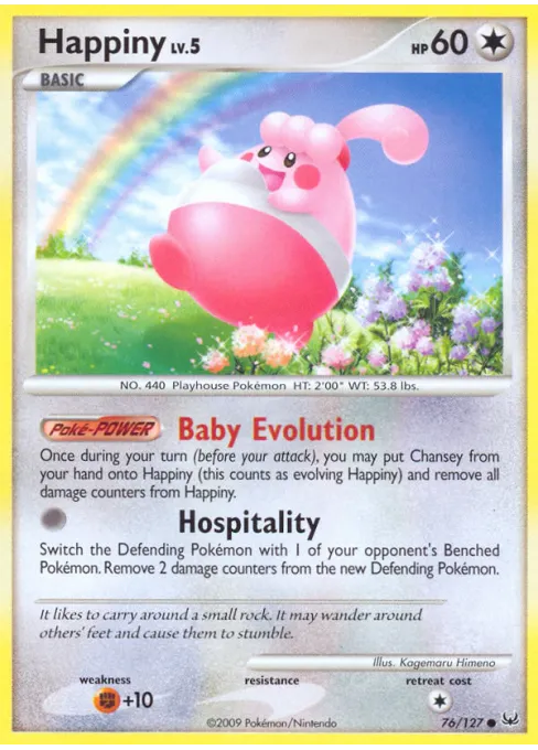 Once during your turn (before your attack), you may put Chansey from your hand onto Happiny (this counts as evolving Happiny) and remove all damage counters from Happiny.
