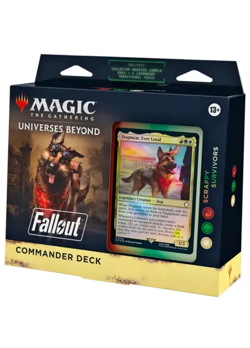 Fallout Commander Deck Scrappy Survivors obsahuje předem konstruovaný herní balíček do hry Magic the Gathering. Balíček má 100 karet a je připravený rovnou ke hře ve formátu commander. K dispozici si můžete vybírat ze dvou foilových generálů. V balení navíc najdete 38 karet, které v jiných baleních v edici nenajdete!