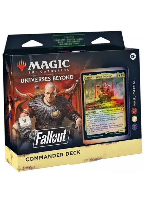 Fallout Commander Deck Hail, Caesar obsahuje předem konstruovaný herní balíček do hry Magic the Gathering. Balíček má 100 karet a je připravený rovnou ke hře ve formátu commander. K dispozici si můžete vybírat ze dvou foilových generálů. V balení navíc najdete 38 karet, které v jiných baleních v edici nenajdete!