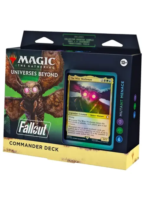 Fallout Commander Deck Mutant Menace obsahuje předem konstruovaný herní balíček do hry Magic the Gathering. Balíček má 100 karet a je připravený rovnou ke hře ve formátu commander. K dispozici si můžete vybírat ze dvou foilových generálů. V balení navíc najdete 38 karet, které v jiných baleních v edici nenajdete!