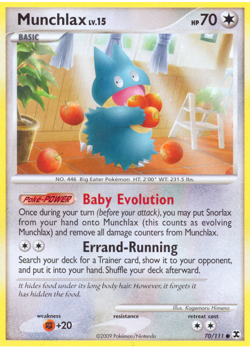 Once during your turn (before your attack), you may put Snorlax from your hand onto Munchlax (this counts as evolving Munchlax) and remove all damage counters from Munchlax.