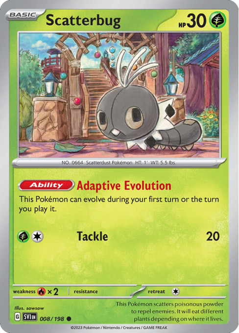 This Pokémon scatters poisonous powder to repel enemies. It will eat different plants depending on where it lives.