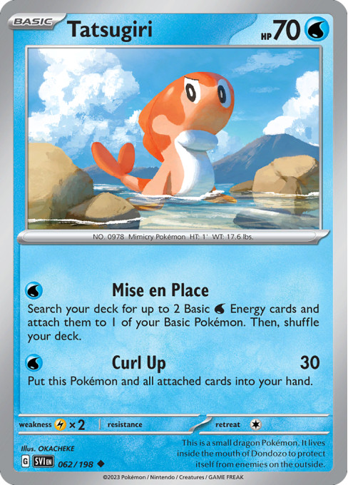 Search your deck for up to 2 Basic Water Energy cards and attach them to 1 of your Basic Pokémon. Then, shuffle your deck.