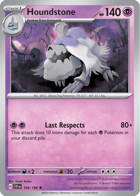 A lovingly mourned Pokémon was reborn as Houndstone. It doesn't like anyone touching the protuberance atop its head.