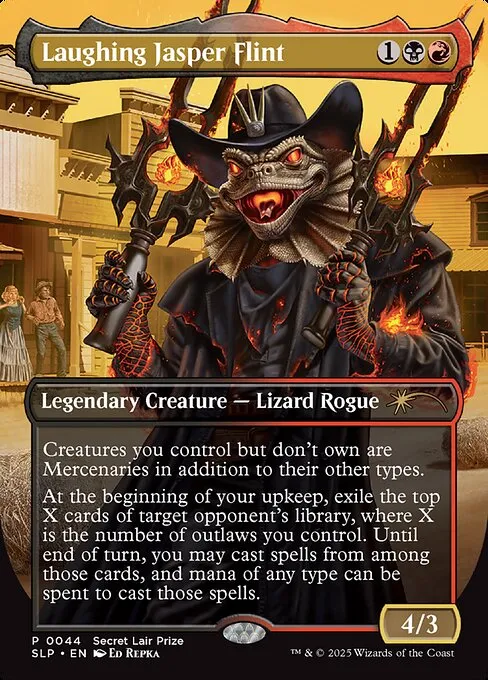 At the beginning of your upkeep, exile the top X cards of target opponent's library, where X is the number of outlaws you control. Until end of turn, you may cast spells from among those cards, and mana of any type can be spent to cast those spells.