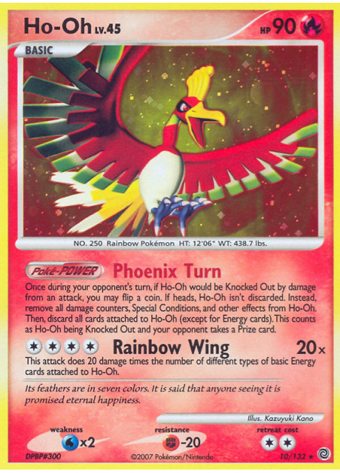 Once during your opponent's turn, if Ho-Oh would be Knocked Out by damage from an attack, you may flip a coin. If heads, Ho-Oh isn't discarded. Instead, remove all damage counter, Special Conditions, and other effects from Ho-Oh. Then, discard all cards attached to Ho-Oh (except for Energy cards). This counts as Ho-Oh being Knocked Out and your opponent takes a Prize card.