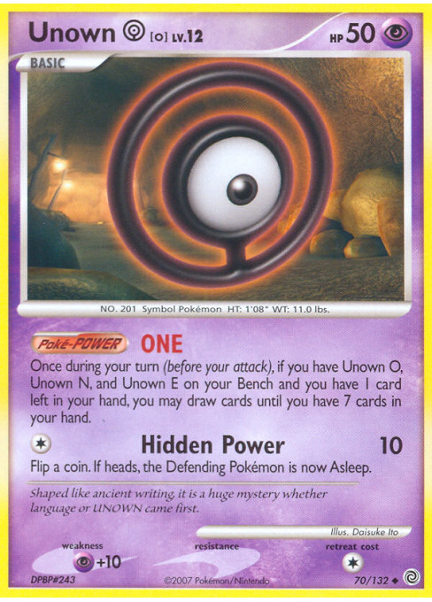 Once during your turn (before your attack), if you have Unown O, Unown N, and Unown E on your Bench and you have 1 card left in your hand, you may draw cards until you have 7 cards in your hand.
