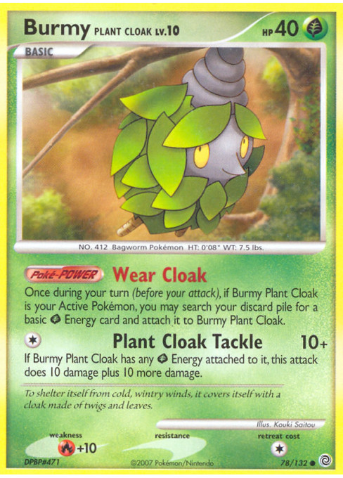 Once during your turn (before your attack), if Burmy Plant Cloak is your Active Pokémon, you may search your discard pile for a basic Grass Energy card and attach it to Burmy Plant Cloak.