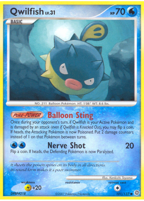 Once during your opponent's turn, if Qwilfish is your Active Pokémon and is damage by an attack (even if Qwilfish is Knocked Out), you may flip a coin. If heads, the Attacking Pokémon is now Poisoned. Put 2 damage counters instead of 1 on that Pokémon between turns.