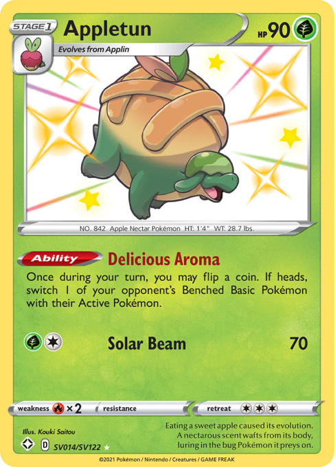 Eating a sweet apple caused its evolution. A nectarous scent wafts from its body, luring in the bug Pokémon it preys on.