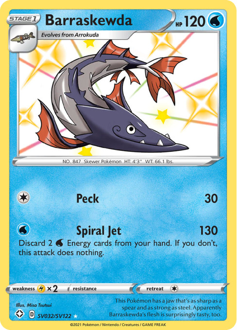 This Pokémon has a jaw that's as sharp as a spear and as strong as steel. Apparently Barraskewda's flesh is surprisingly tasty, too.