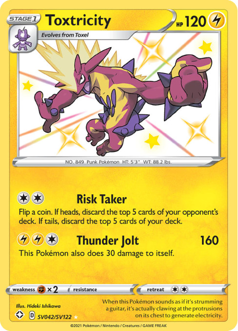 When this Pokémon sounds as if it's strumming a guitar, it's actually clawing at the protrusions on its chest to generate electricity.
