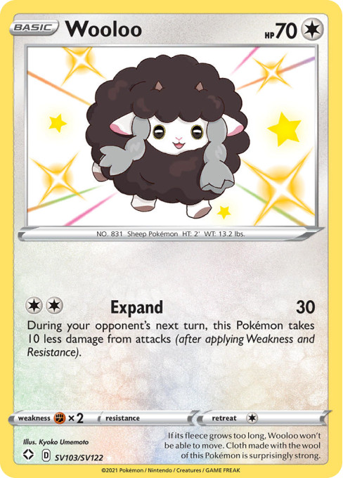 If its fleece grows too long, Wooloo won't be able to move. Cloth made with the wool of this Pokémon is surprisingly strong.