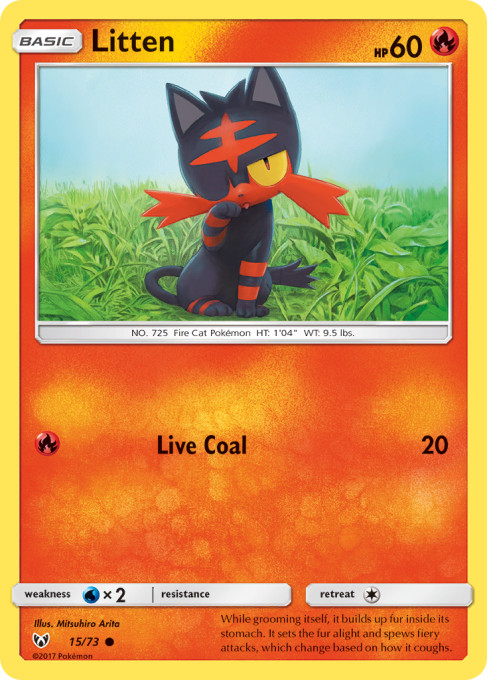 While grooming itself, it builds up fur inside its stomach. It sets the fur alight and spews fiery attacks, which change based on how it coughs.