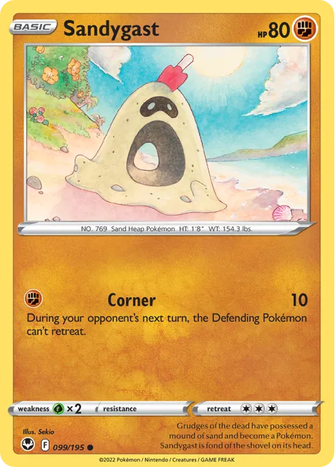 Grudges of the dead have possessed a mound of sand and become a Pokémon. Sandygast is fond of the shovel on its head.