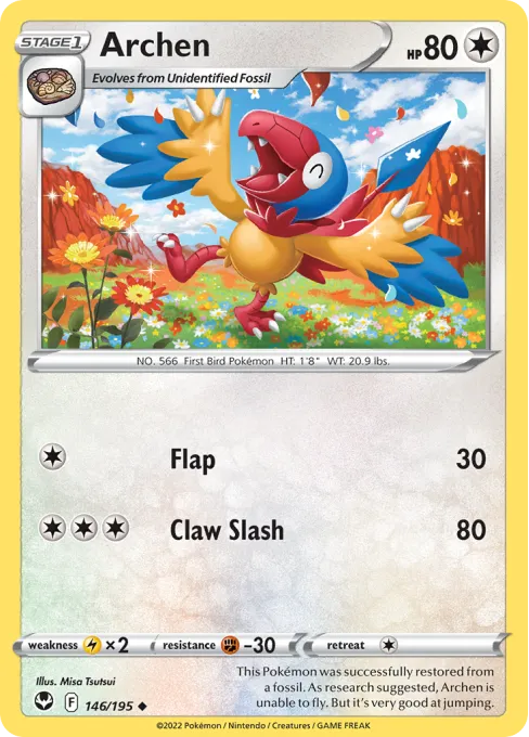 This Pokémon was successfully restored from a fossil. As research suggested, Archen is unable to fly. But it's very good at jumping.