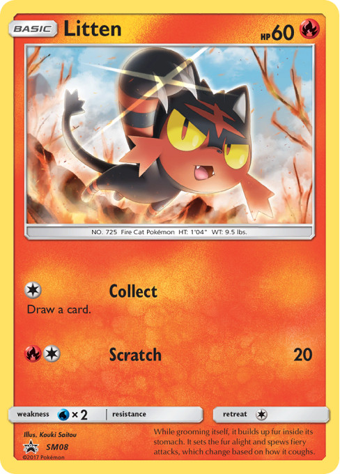 While grooming itself, it builds up fur inside its stomach. It sets the fur alight and spews fiery attacks, which change based on how it coughs.