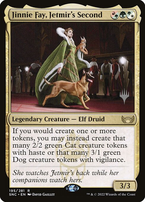 If you would create one or more tokens, you may instead create that many 2/2 green Cat creature tokens with haste or that many 3/1 green Dog creature tokens with vigilance.