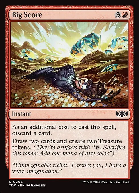 Draw two cards and create two Treasure tokens. (They're artifacts with ", Sacrifice this token: Add one mana of any color.")