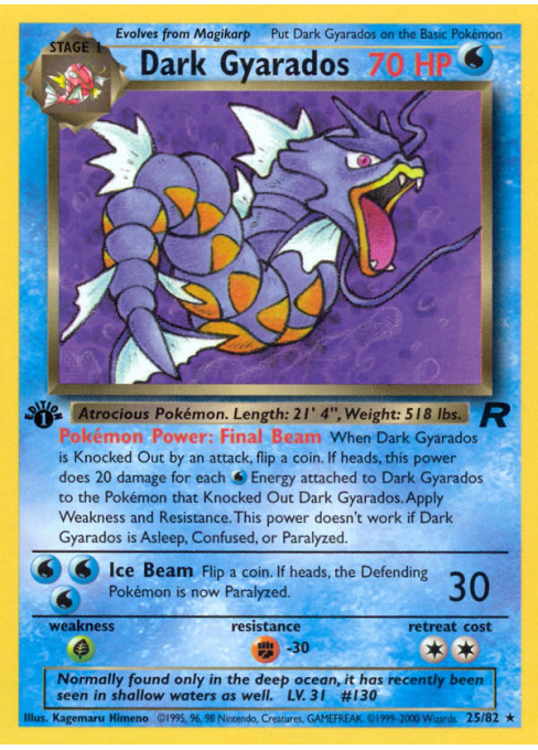 When Dark Gyarados is Knocked Out by an attack, flip a coin. If heads, this power does 20 damage for each Water Energy attached to Dark Gyarados to the Pokémon that Knocked Out Dark Gyarados. Apply Weakness and Resistance. This power doesn't work if Dark Gyarados is Asleep, Confused, or Paralyzed.