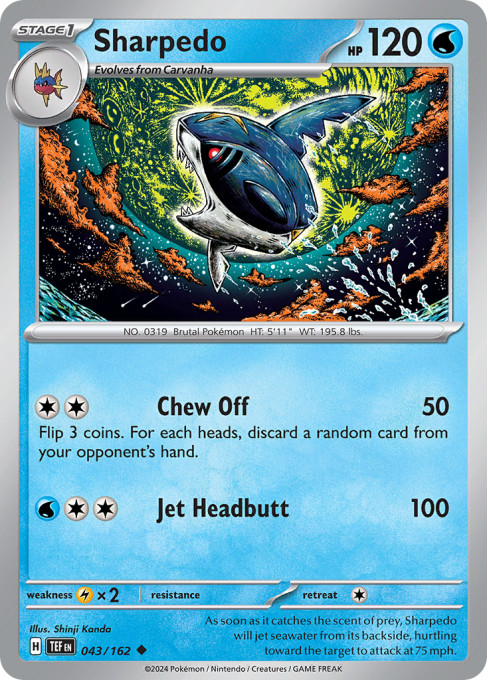 As soon as it catches the scent of prey, Sharpedo will jet seawater from its backside, hurtling toward the target to attack at 75 mph.