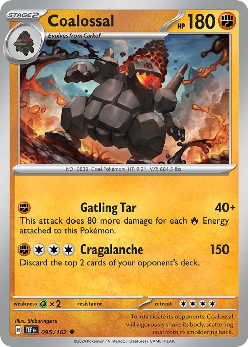 To intimidate its opponents, Coalossal will vigorously shake its body, scattering coal from its smoldering back.