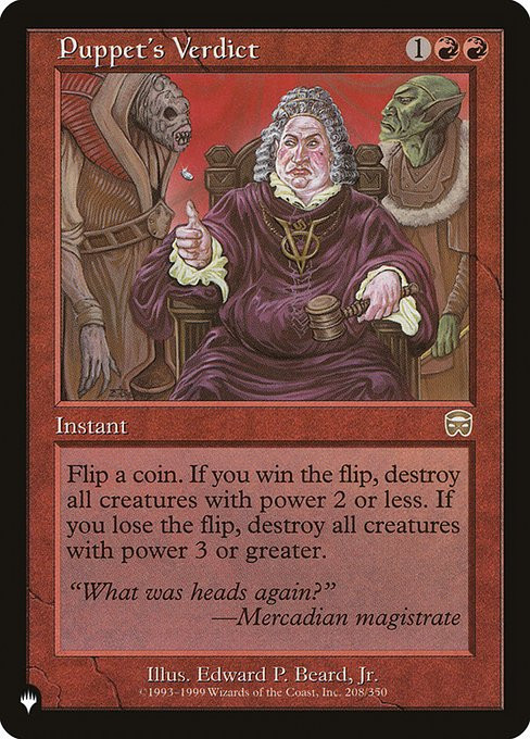 Flip a coin. If you win the flip, destroy all creatures with power 2 or less. If you lose the flip, destroy all creatures with power 3 or greater.