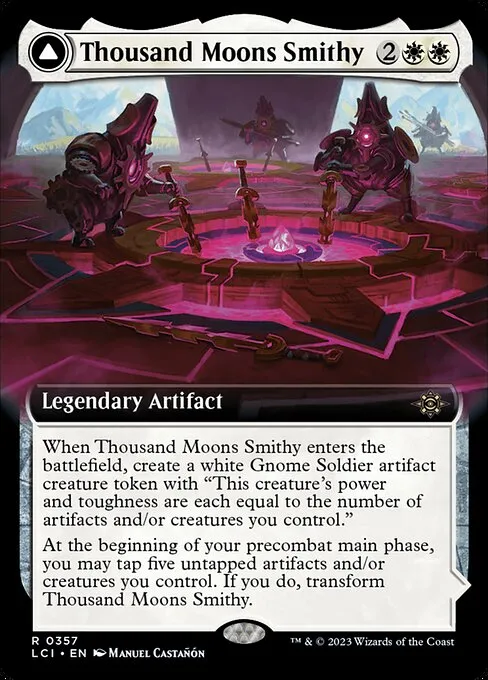 When Thousand Moons Smithy enters, create a white Gnome Soldier artifact creature token with "This creature's power and toughness are each equal to the number of artifacts and/or creatures you control."
