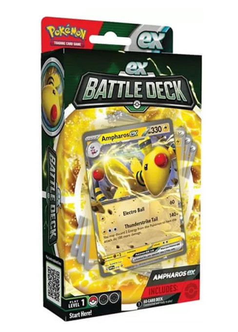 Pokémon TCG Ampharos ex Battle Deck je balení obsahující hotový herní balíček s bleskovým Pokémonem Ampharos ex a herní příslušenství. Tento předpřipravený balíček ocení zejména začínající a méně zkušení hráči karetní hry Pokémon. Výhodou tohoto balíčku je, že ho hned po rozbalení můžete hrát. Navíc se stanete držitelem první unikátní ex karty Pokémona Ampharos.