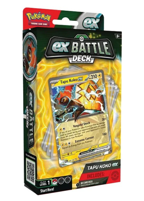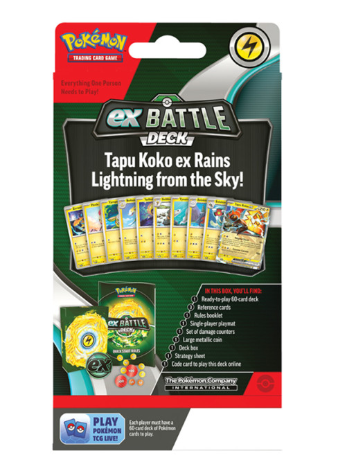 Pokemon TCG Tapu Koko ex Battle Deck je balení, které obsahuje jeden předem připravený herní balíček elektrických Pokemonů. Herní příslušenství, které ocení zejména začátečníci, kteří chtějí začít hrát karetní hru Pokémon a mít ve sbírce zajímavý herní balíček se silným Pokémonem ex. Součástí balení je také kód do online hry a pravidla v anglickém jazyce.