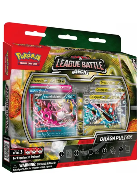 Pokémon Dragapult ex patří k nejsilnějším dračím Pokémonům vůbec. V balíčku naleznete další velmi užitečné karty, jako například Boss's Orders, Unfair Stamp, Iono a další. Díky tomu se z tohoto produktu stává velmi stabilní balíček. V 60-ti karetním balíku naleznete nejen parádní karty Pokémonů ex, ale také další užitečné Pokémony a řadu podpůrných trenérských karet. V balení nesmí chybět ani turnajové příslušenství, aby mohla začít série napínavých ligový soubojů!