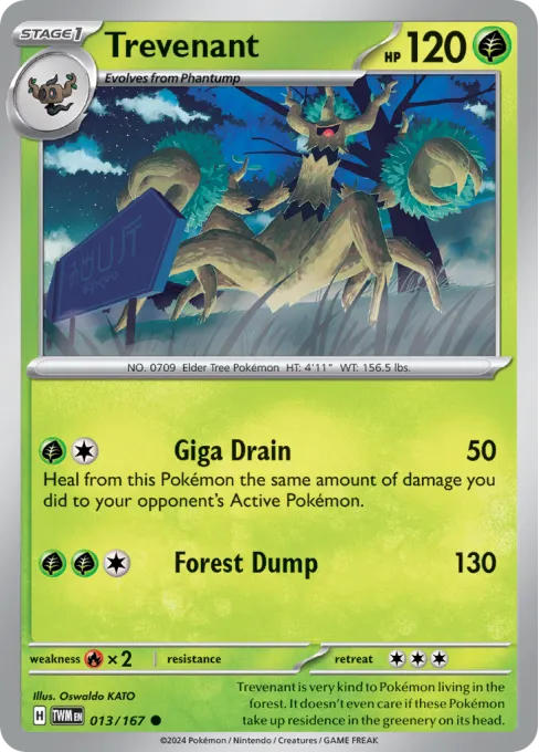 Trevenant is very kind to Pokémon living in the forest. It doesn't even care if these Pokémon take up residence in the greenery on its head.
