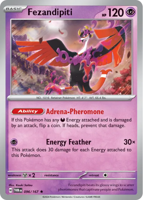 Fezandipiti beats its glossy wings to scatter pheromones that captivate people and Pokémon.