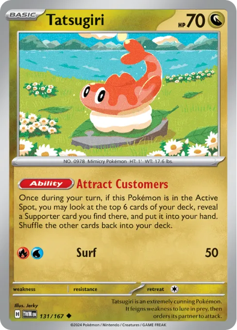 Tatsugiri is an extremely cunning Pokémon. It feigns weakness to lure in prey, then orders its partner to attack.