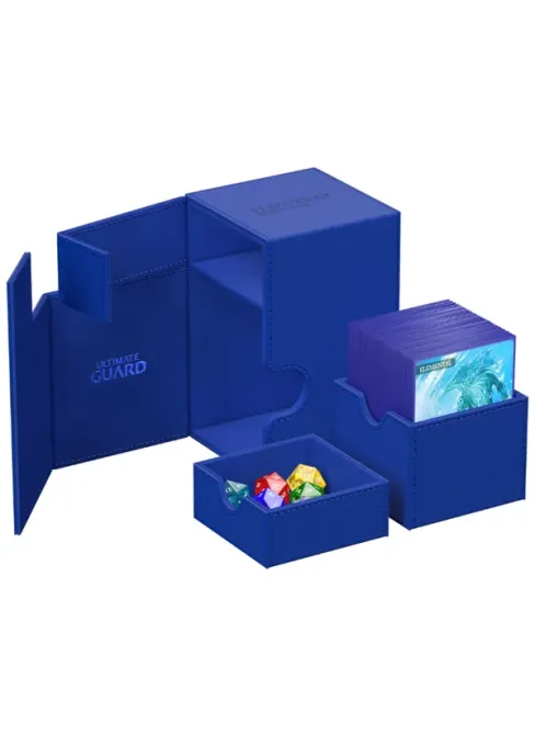Prémiová pevná kožená krabička ULTIMATE GUARD: FLIP'N'TRAY 100+ Blue. Vnitřek krabičky je vyroben z příjemného mikrovlákna a vnější povrch z kůže XenoSkin s protiskluzovou úpravou. Krabička má boční vkládání a šikovné magnetické otevírání, takže se pohodlně a rychle dostanete k obsahu.