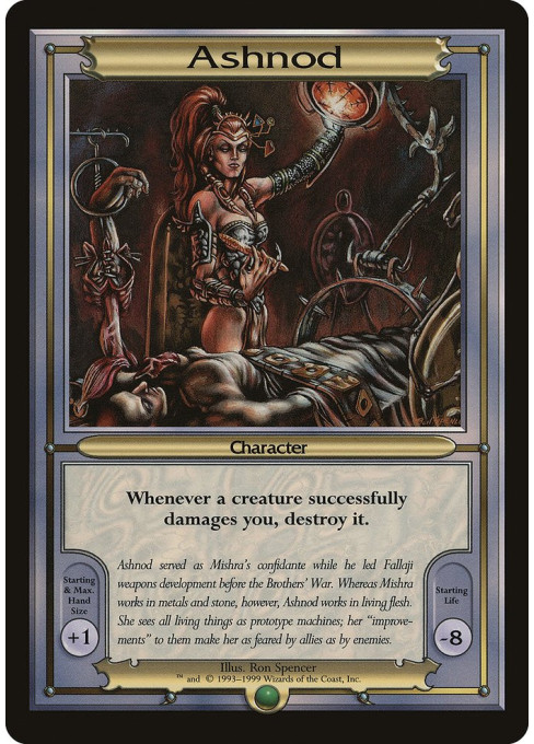 Ashnod served as Mishra's confidante while he led Fallaji weapons development before the Brothers' War. Whereas Mishra works in metals and stone, however, Ashnod works in living flesh. She sees all living things as prototype machines; her "improvements" to them make her as feared by allies as by enemies.