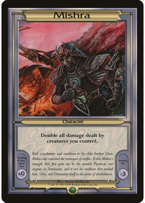 "Both complement and antithesis to his older brother Urza, Mishra also mastered the intricacies of artifice. It was Mishra's strength that first gave rise to the massive Phyrexian war engines on Dominaria, and it was his weakness that pushed him, Urza, and Dominaria itself to the point of annihilation."