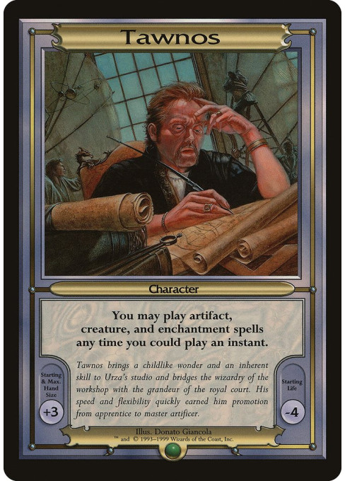 "Tawnos brings a childlike wonder and an inherent skill to Urza's studio and bridges the wizardry of the workshop with the grandeur of the royal court. His speed and flexibility quickly earned him promotion from apprentice to master artificer."
