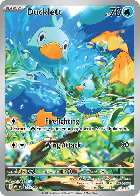 These bird Pokémon are excellent divers. They swim around in the water eating their favorite food--peat moss.