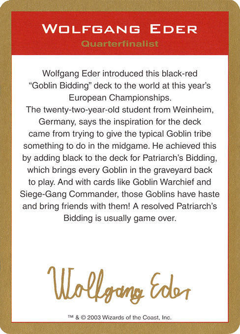 Wolfgang Eder introduced this black-red "Goblin Bidding" deck to the world at this year's European Championships. The twenty-two-year-old student from Weinheim, Germany, says the inspiration for the deck came from trying to give the typical Goblin tribe something to do in the midgame. He achieved this by adding black to the deck for Patriarch's Bidding, which brings every Goblin in the graveyard back to play. And with cards like Goblin Warchief and Siege-Gang Commander, those Goblins have haste and bring friends with them! A resolved Patriarch's Bidding is usually game over.